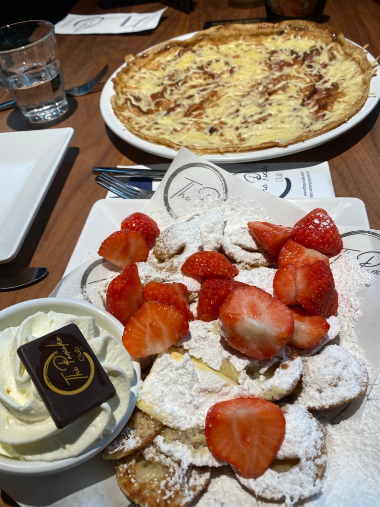 For lunch, we stumbled across what was actually the perfect place for us, The Pancake Club. Riana and I shared a Dutch pancake with bacon and cheese (wow), as well as a platter of pancake puffs, aka poffertjes, with strawberries and whipped cream (big wow).